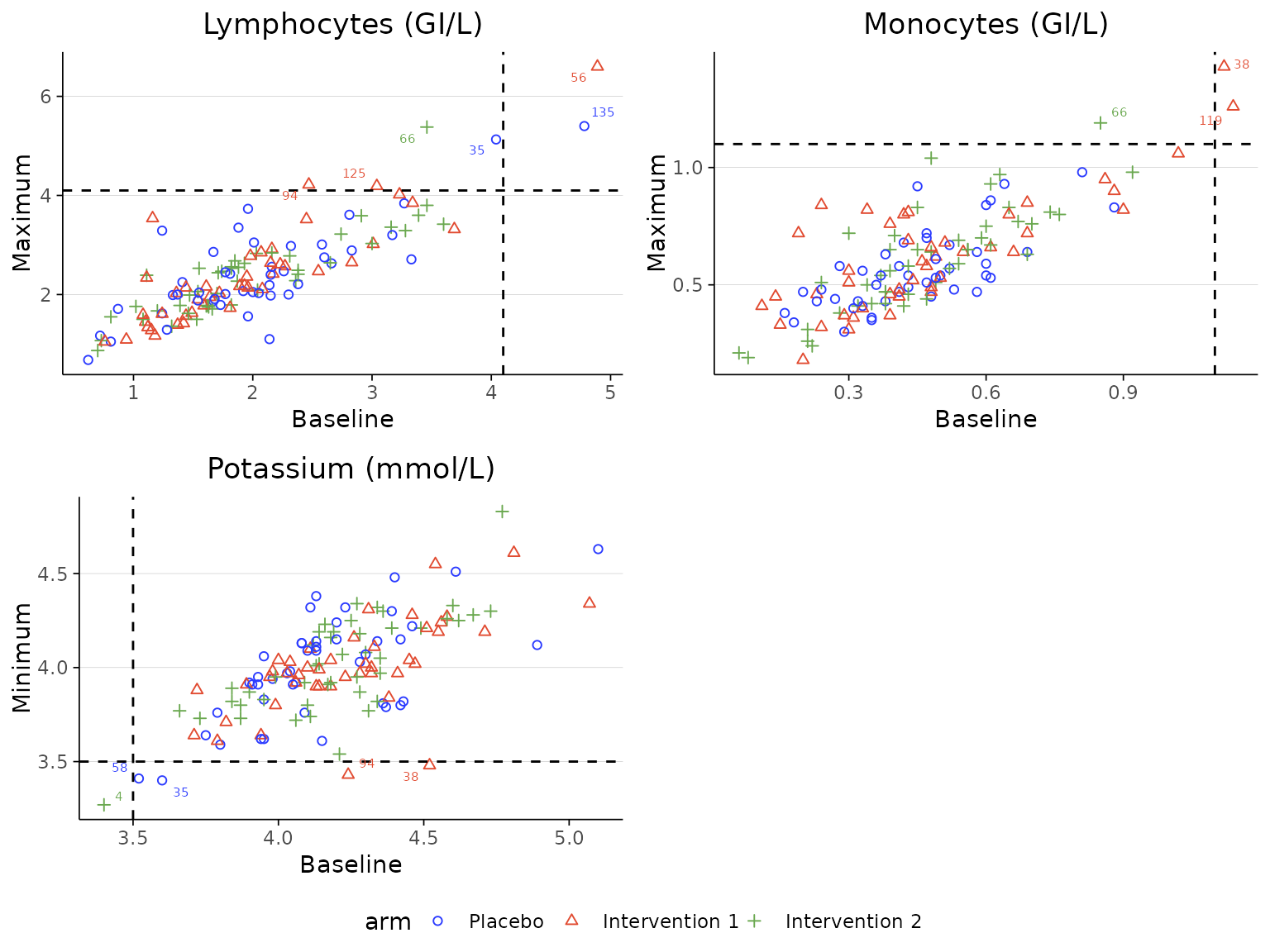 labscatter(lab3, arm_levels=c("Placebo", "Intervention 1", "Intervention 2"),