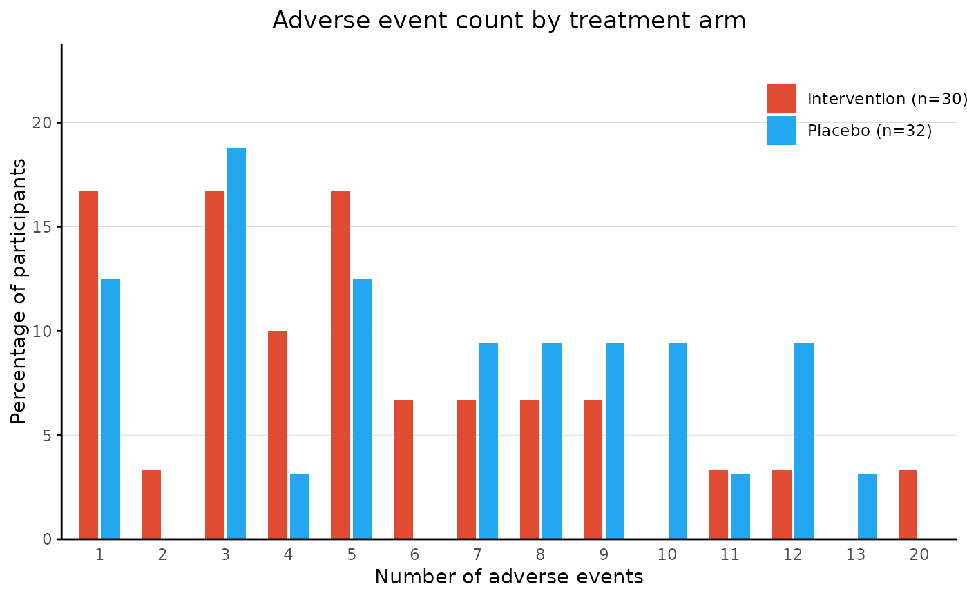 aebar(df2, arm_levels=c("Intervention","Placebo"), adverse_event="ae_pt", facets=FALSE)