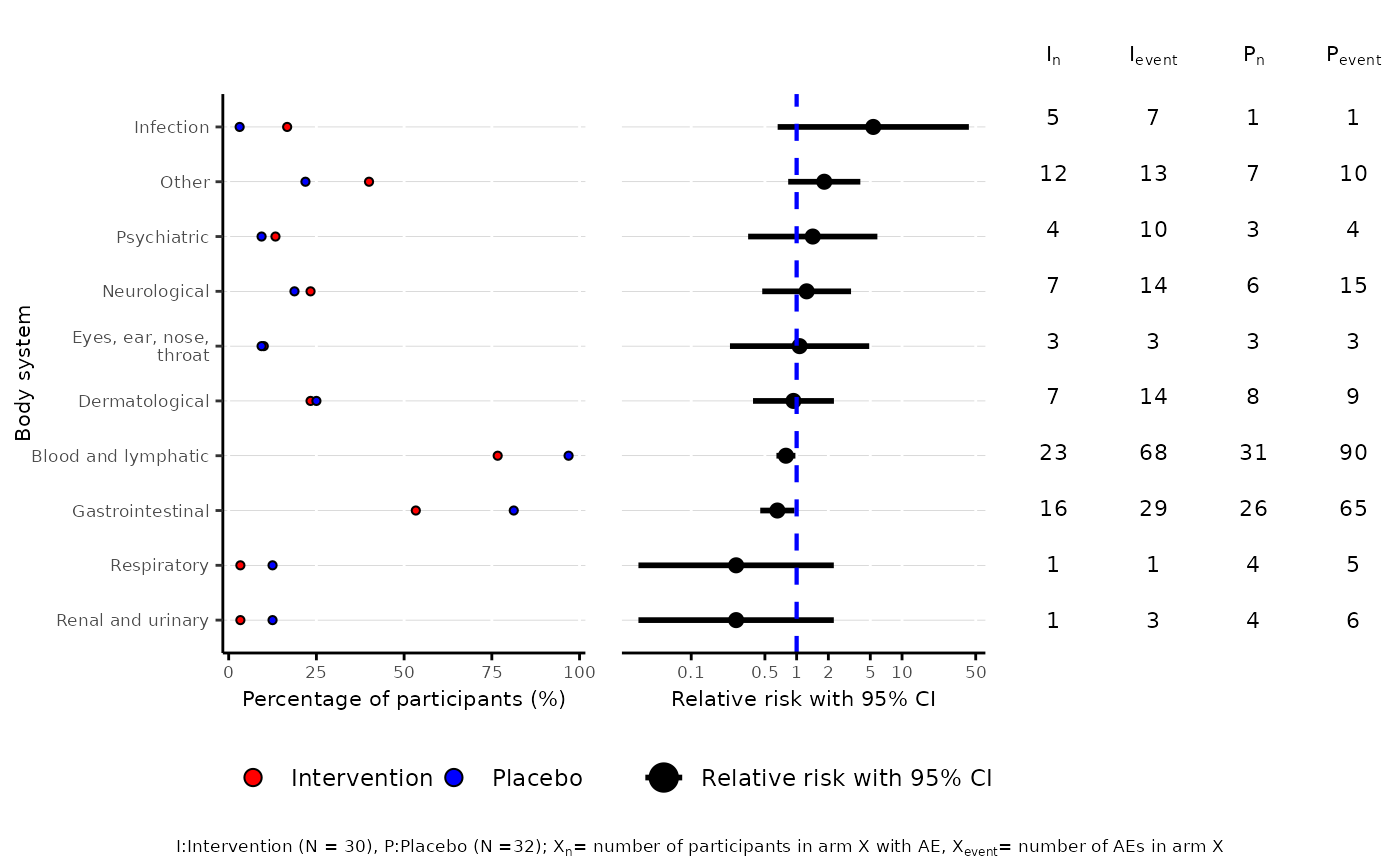 aedot(df2, body_system_class="aebodsys", control="Placebo", intervention="Intervention")
