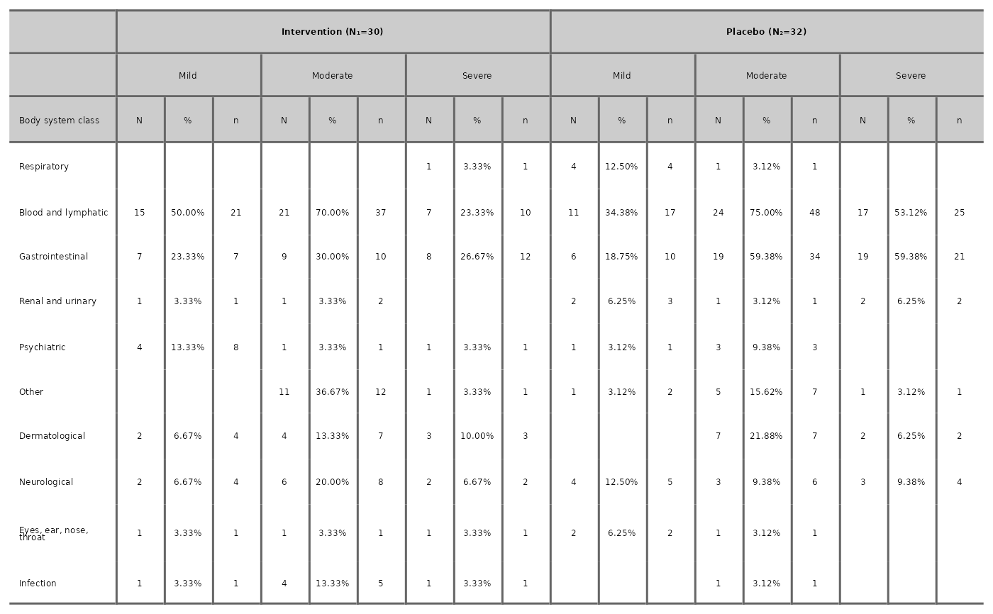 N: Frequency (number of participants with at least one event for each severity level and body system class)