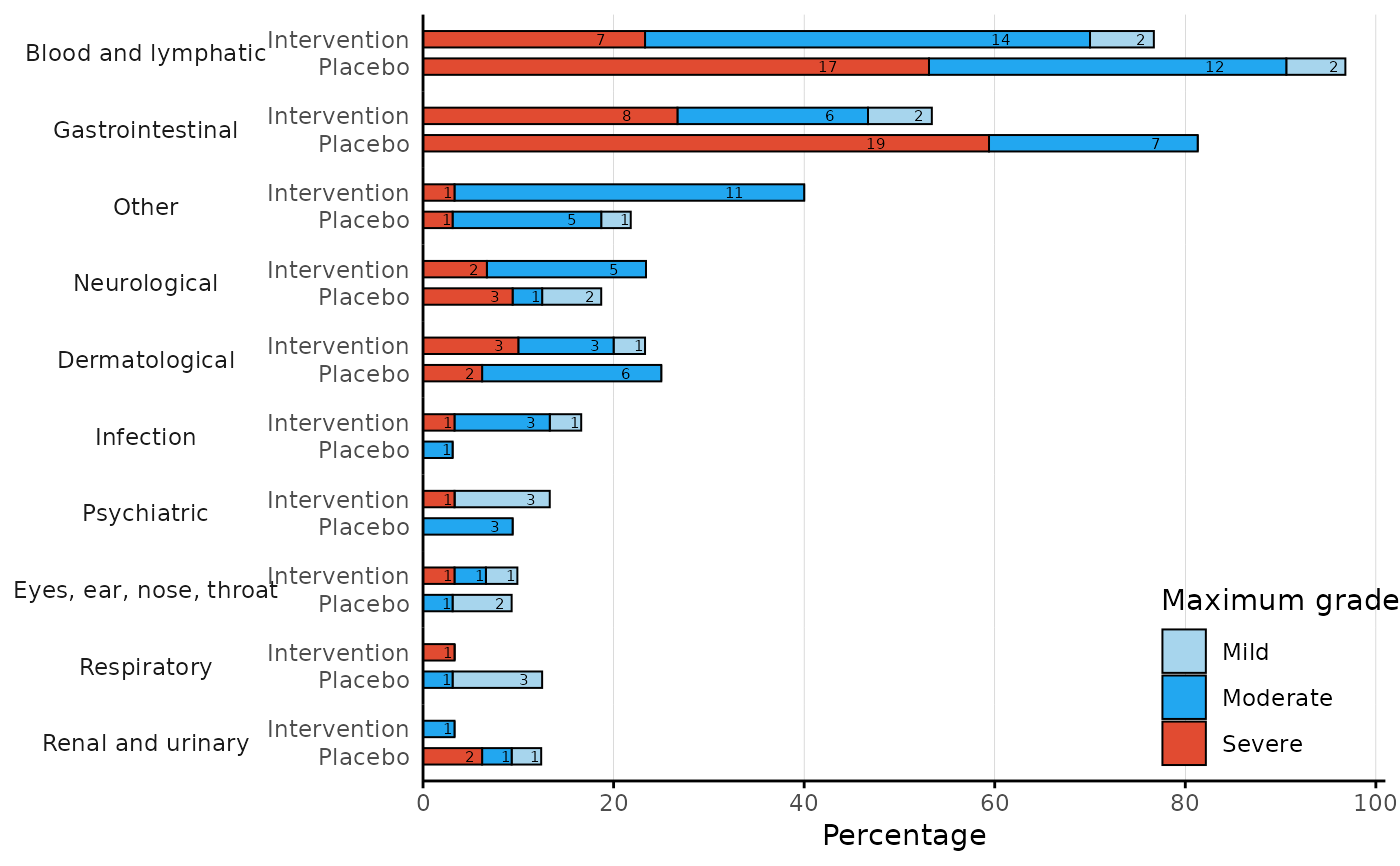 Stacked bar chart of proportions for each body system class by arm and maximum severity